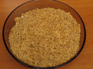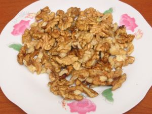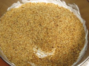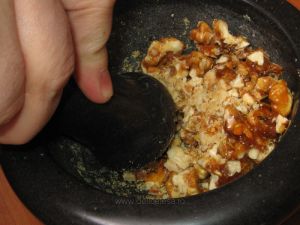 Nucile se bagă la cuptor la 200 grade timp de 5-10 minute, cât să se prăjească puţin, apoi se pisează.
