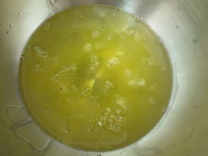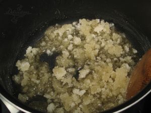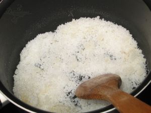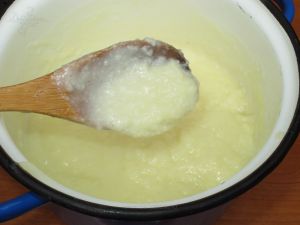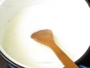 După ce s-a omogenizat, se pune pe foc, amestecând continuu, până se îngroaşă. Se lasă să se răcească şi se adaugă esenţa.