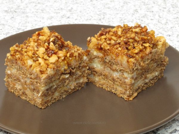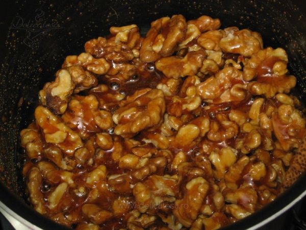 La final, se adaugă ultima foaie, restul de cremă şi nuci caramelizate.