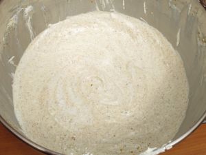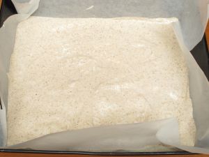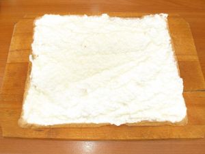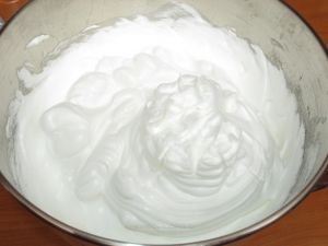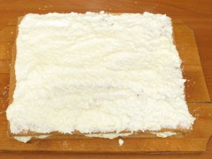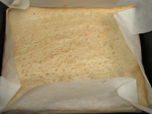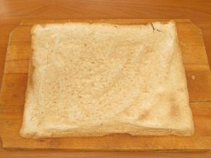 Compoziţia se împarte în 3 şi se coc 3 foi, pe hârtie de copt, în cuptorul încins, până se rumenesc.