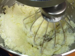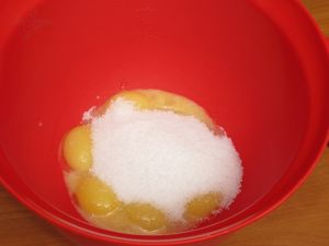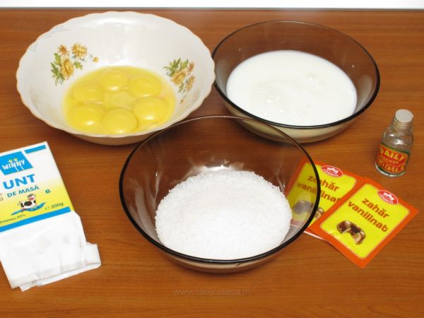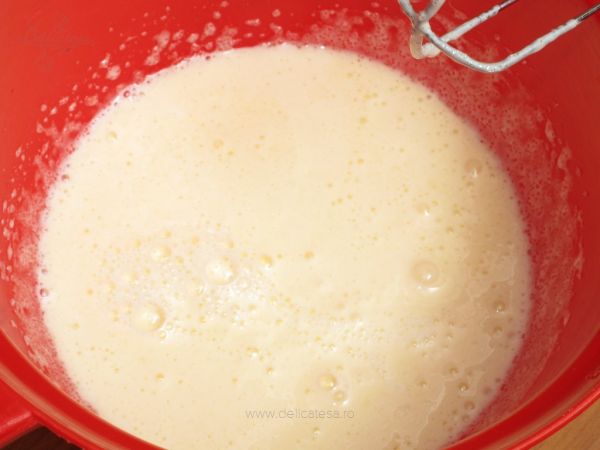 Se freacă gălbenuşurile cu zahărul, zahărul vanilat şi laptele rece.