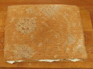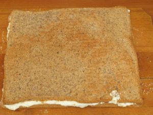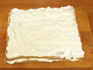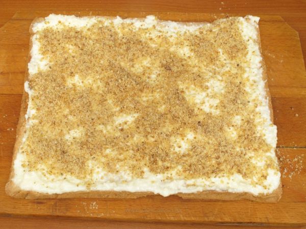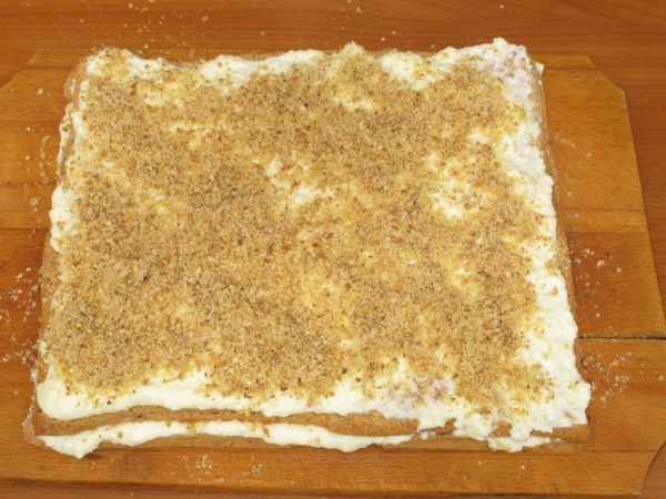 Se pune cea de-a doua foaie, se adaugă încă o treime din cremă, apoi iar nuci caramelizate.